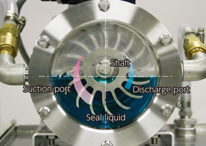 3. The Vacuum Creation Cycle. Because the impeller is mounted off-center, the space between the impeller hub and the liquid ring varies around the rotation. This creates three continuous zones: