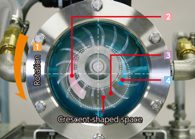 1. Initial Setup. A multi-bladed impeller is mounted off-center (eccentrically) inside a circular pump casing. The casing is partially filled with a sealing liquid (typically water). The impeller is connected to a motor that makes it rotate at high speed.